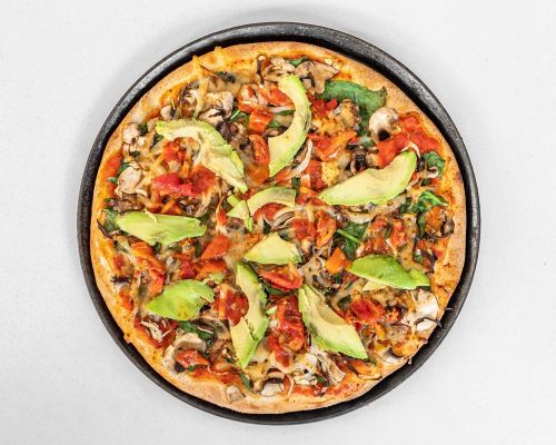 Made with olive oil base, vegan cheese, mushroom, spinach, onion, garlic, avocado, sun dried tomato and oregano.