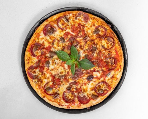 Made with Italian tomato, olives, oregano, hot salami and basil.