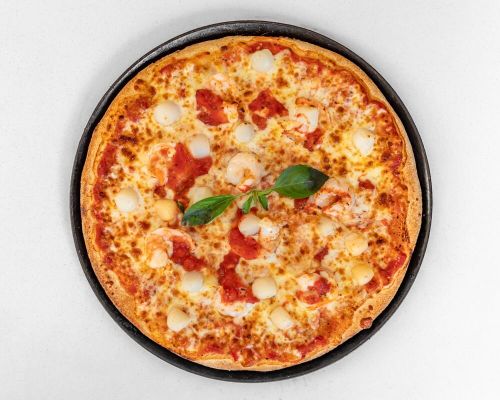 Made with large prawns, scallops, garlic, Italian tomato and mozzarella.
