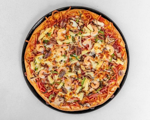 Made with tomato, mozzarella, mushrooms, pepperoni, capsicum, pineapple, onions, olives and prawns