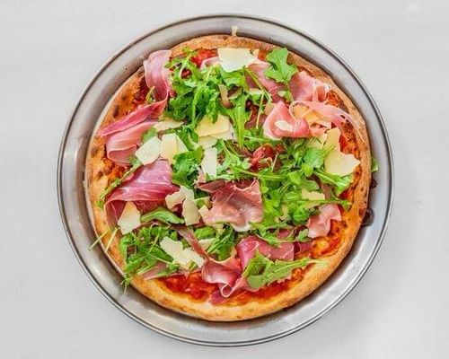 Made with Italian tomato and mozzarella topped with prosciutto, rocket and shaved parmesan.